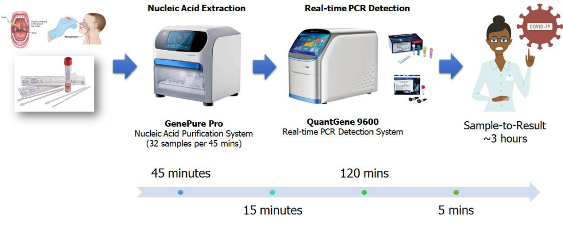 - Reagent preparation area เป็นพื้นที่สำหรับเตรียมน้ำยา Real-time RT-PCR Detection ที่ควรแยกจากห้อง เตรียมตัวอย่างห้องปฏิบัติการควรเลือกใช้ชุดน้ำยา Real-time RT-PCR Detection ในการตรวจยืนยันการติดเชื้อ COVID-19 ที่จำเพาะต่อยีนของเชื้อ SARS-COV-2 อย่างน้อย 2 ตำแหน่ง โดยอาจใช้มากกว่า 1 ชุดน้ำยาในการตรวจ ยืนยันได้