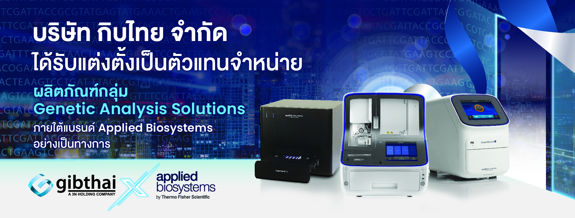 บริษัท กิบไทย จำกัด มีความยินดีที่จะแจ้งให้ทราบว่าบริษัทฯ ได้รับพิจารณาแต่งตั้งจากบริษัท Thermo Fisher Scientific, Inc. ประเทศสหรัฐอเมริกา ให้เป็นตัวแทนจำหน่าย (Authorized Distributor) ผลิตภัณฑ์ในกลุ่ม Genetic Analysis Portfolio ภายใต้แบรนด์ Applied Biosystems อย่างเป็นทางการในประเทศไทย นับตั้งแต่วันที่ 1 มกราคม 2566 เป็นต้นไป
