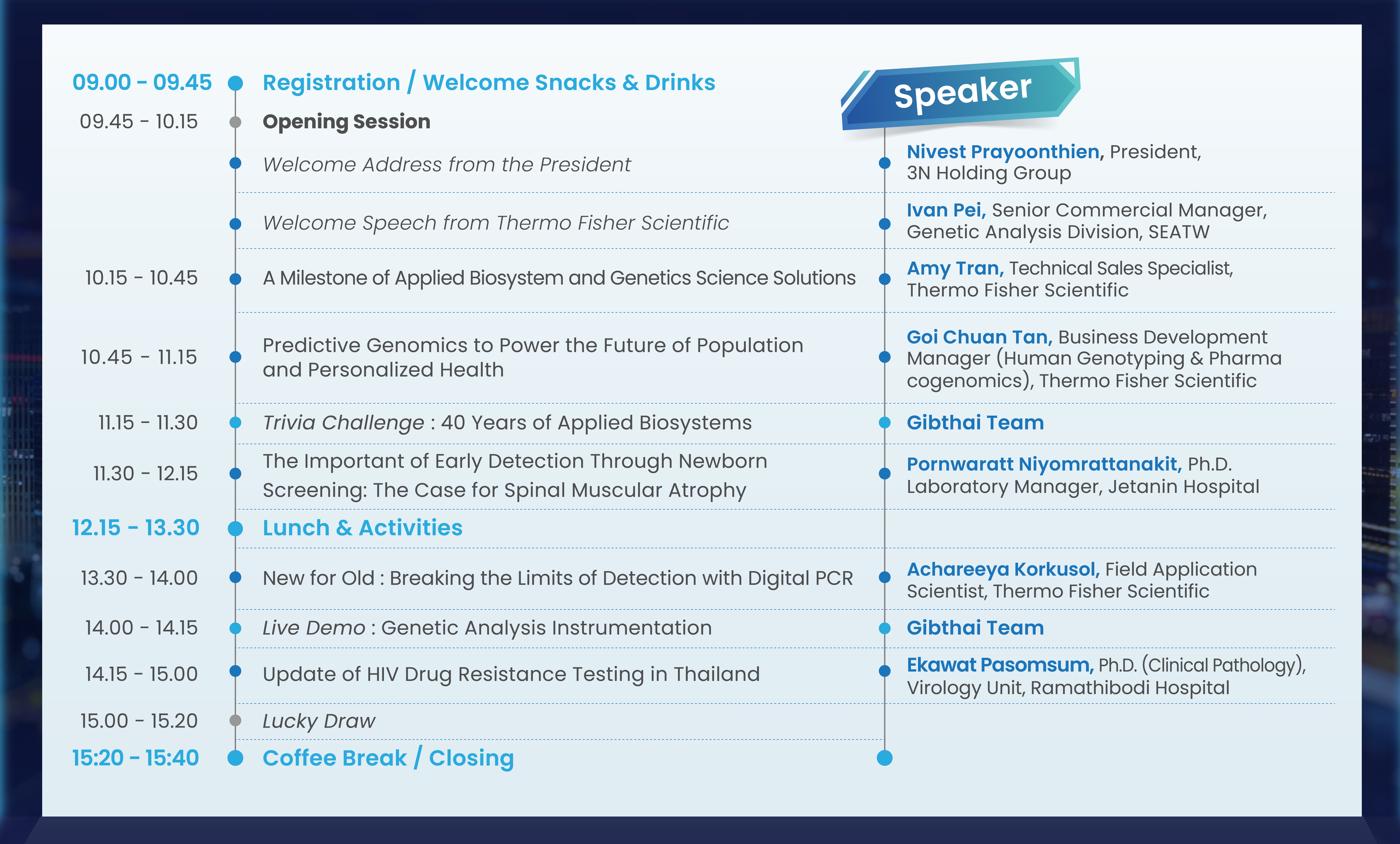 งานเปิดตัวการเป็นตัวแทนจำหน่าย ผลิตภัณฑ์ในกลุ่ม Genetic Analysis Portfolio ภายใต้แบรนด์ Applied Biosystems ของ Thermo Fisher Scientific ประเทศสหรัฐอเมริกา ที่ได้พิจารณาแต่งตั้งให้บริษัท กิบไทย จำกัดเป็นตัวแทนจำหน่าย (Authorized Distributor) อย่างเป็นทางการในประเทศไทย ตั้งแต่วันที่ 1 มกราคา 2566 ที่ผ่านา โดย Portfolio นี้ประกอบไปด้วยผลิตภัณฑ์ 4 กลุ่มใหญ่ ๆ คือ กลุ่ม Capillary Electrophoresis Sequencing, กลุ่ม Real-time PCR, กลุ่ม Digital PCR, และกลุ่ม Microarray ภายในงานมีการบรรยายในหัวข้อเกี่ยวกับ Genetic Analysis Solutions จากวิทยากรผู้ทรงความรู้ จากโรงพยาบาลเจตนิน คณะแพทยศาสตร์ โรงพยาบาลรามาธิบดี และผู้เชี่ยวชาญจาก Thermo Fisher Scientific ทำให้เห็นว่าเทคโนโลยีทางพันธุกรรมกำลังเปลี่ยนแปลงอนาคตอย่างไร ในงานวิจัยด้านการแพทย์ระดับจีโนม ครอบคลุมตั้งแต่การศึกษาทางด้าน Predictive Genomics, Pharmacogenomics รวมไปถึง Agricultural Genomics และการศึกษาวิจัยทางพันธุกรรมด้านอื่นๆ อีกมากมาย ณ โรงแรมเรเนซองส์ กรุงเทพฯ ราชประสงค์ วันที่ 9 มีนาคม 2566