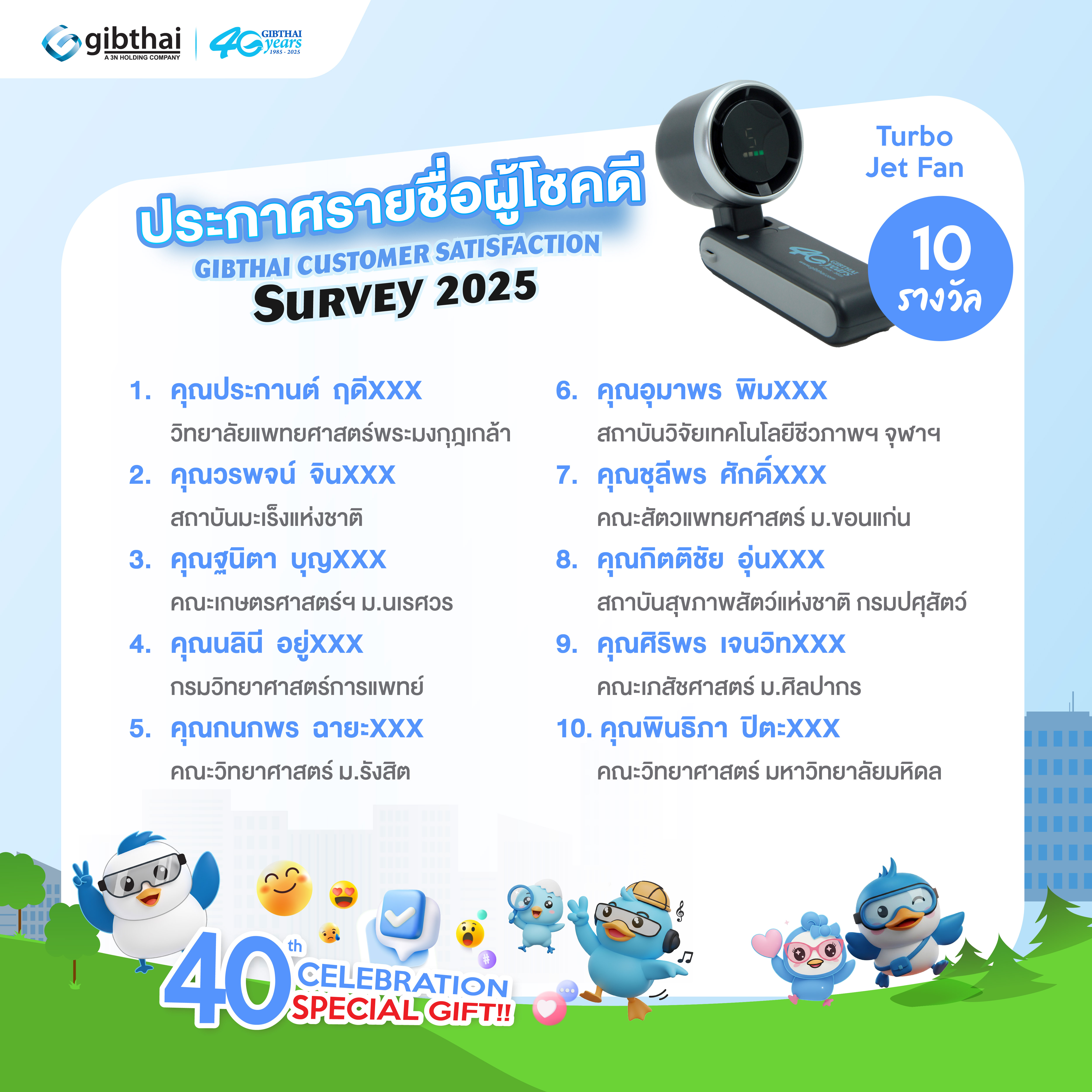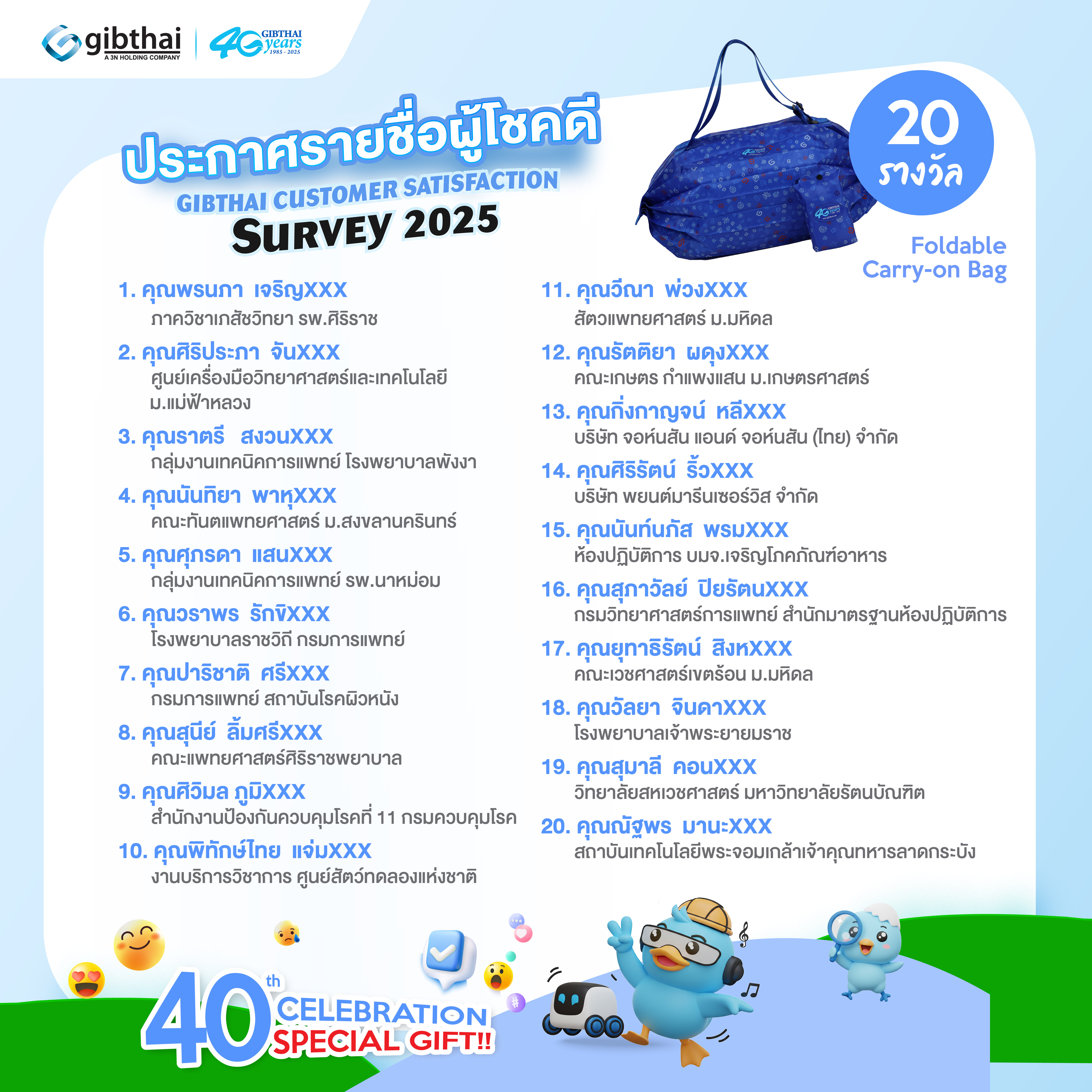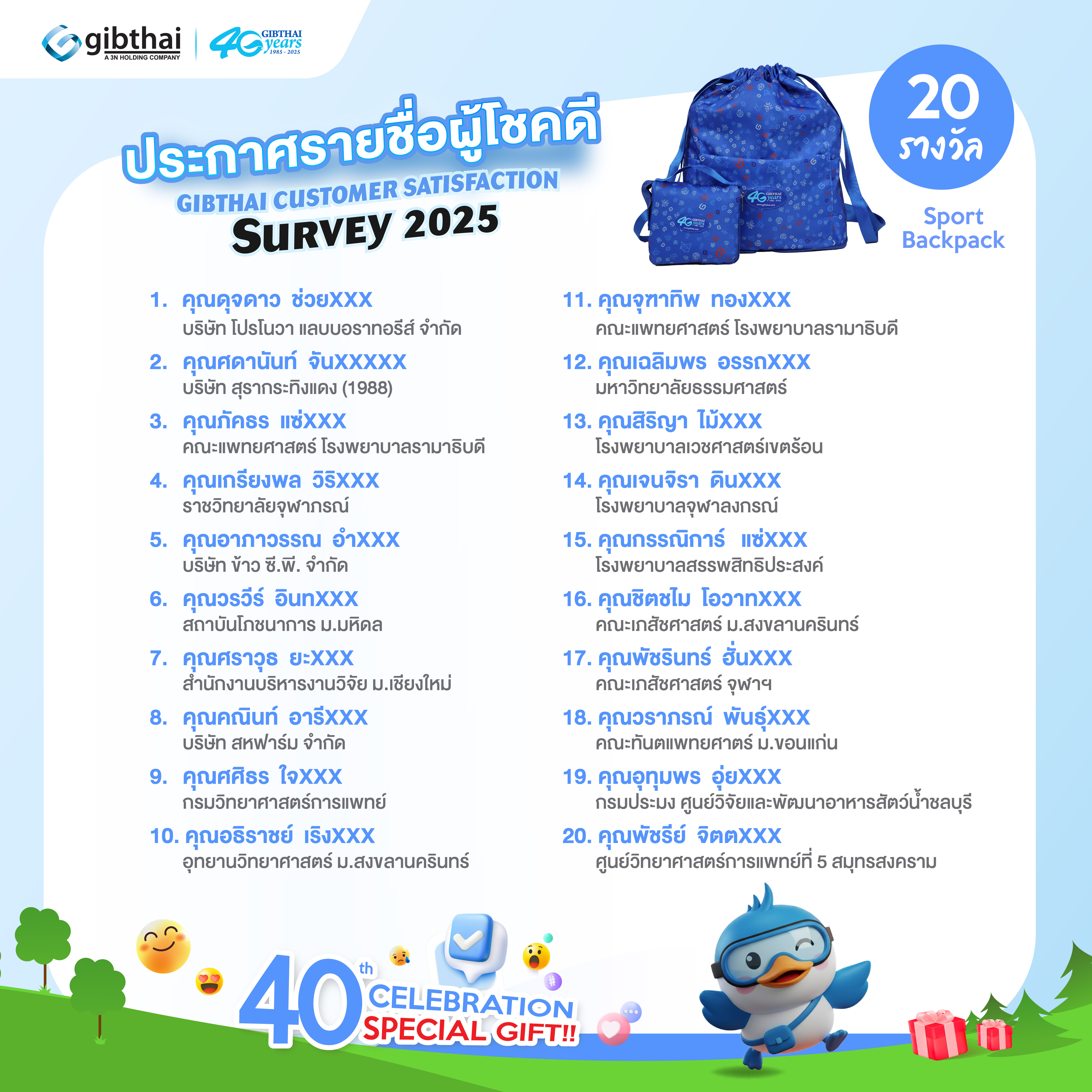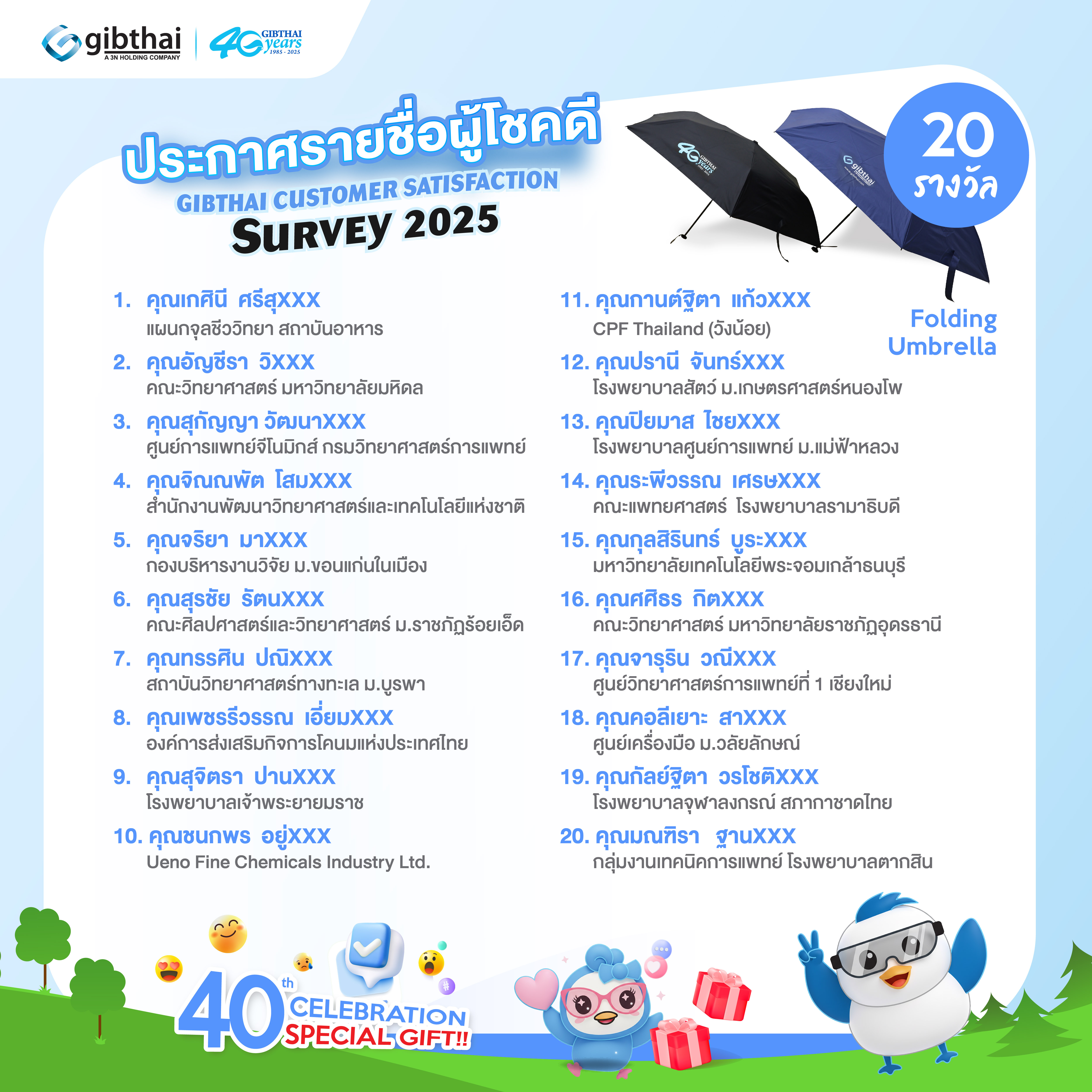 รายชื่อผู้โชคดีกิจกรรมร่วมตอบแบบสอบถาม Gibthai Customer Satisfaction Survey 2025