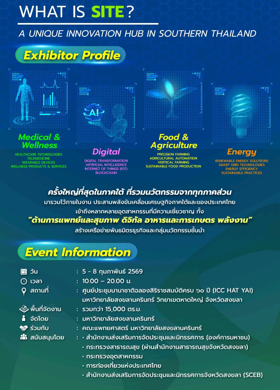 มหกรรมนวัตกรรมและเทคโนโลยีระดับนานาชาติที่ยิ่งใหญ่ที่สุดในภาคใต้ ชูแนวคิด "สุขภาพ นวัตกรรม และความยั่งยืน" รวบรวมเทคโนโลยีล้ำสมัย ทั้งด้านการแพทย์, ดิจิทัล, อาหารและการเกษตร เพื่อขับเคลื่อนเศรษฐกิจและยกระดับคุณภาพสังคม