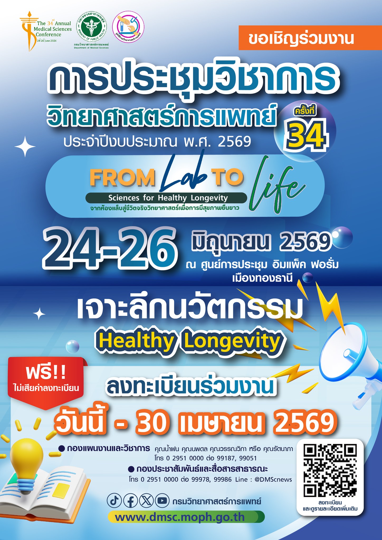 การประชุมวิชาการวิทยาศาสตร์การแพทย์ ครั้งที่ 34 ภายใต้แนวคิด “From Lab to Life Sciences for Healthy Longevity จากห้องแล็บสู่ชีวิตจริง วิทยาศาสตร์เพื่อการมีสุขภาพที่ยืนยาว”