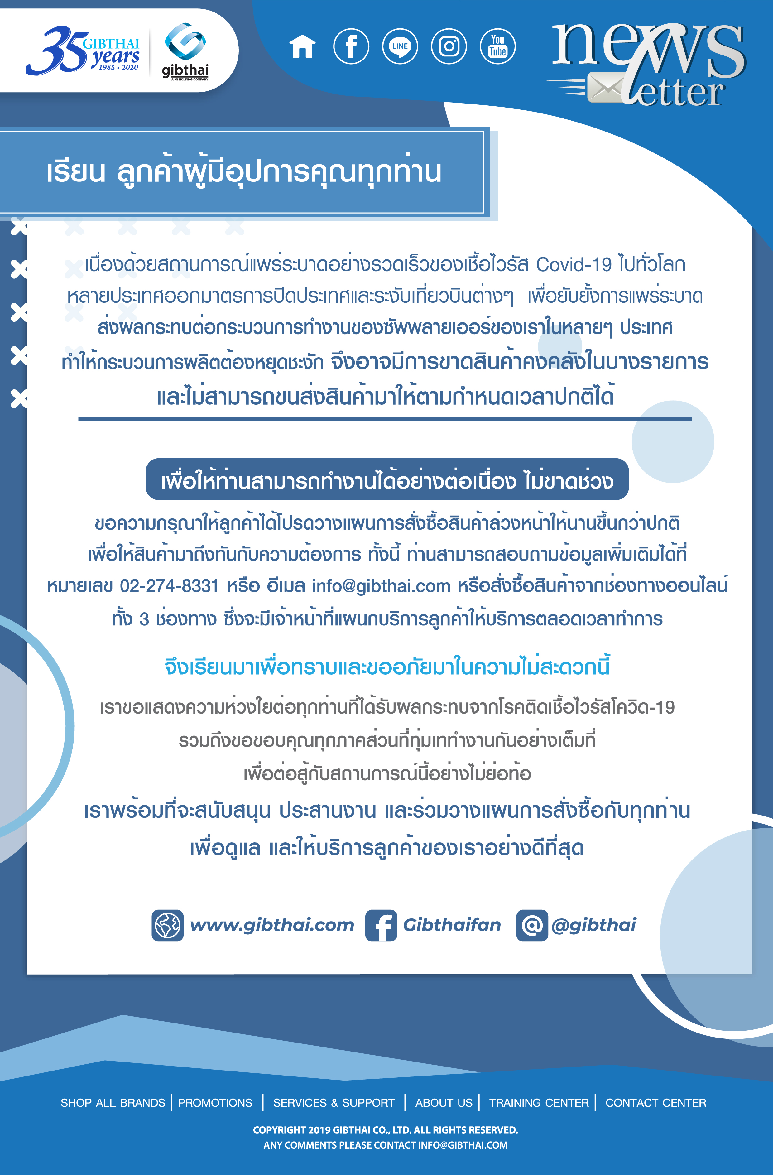 เนื่องด้วยสถานการณ์แพร่ระบาดอย่างรวดเร็วของเชื้อไวรัส Covid-19 ไปทั่วโลก หลายประเทศออกมาตรการปิดประเทศ และระงับเที่ยวบินต่าง ๆ เพื่อยับยั้งการแพร่ระบาด ส่งผลกระทบต่อกระบวนการทำงานของซัพพลายเออร์ของเราในหลาย ๆ ประเทศ ทำให้กระบวนการผลิต และการขนส่งต้องหยุดชะงัก จึงอาจมีการขาดสินค้าคงคลังในบางรายการ และไม่สามารถขนส่งสินค้ามาให้ตามกำหนดเวลาปกติได้