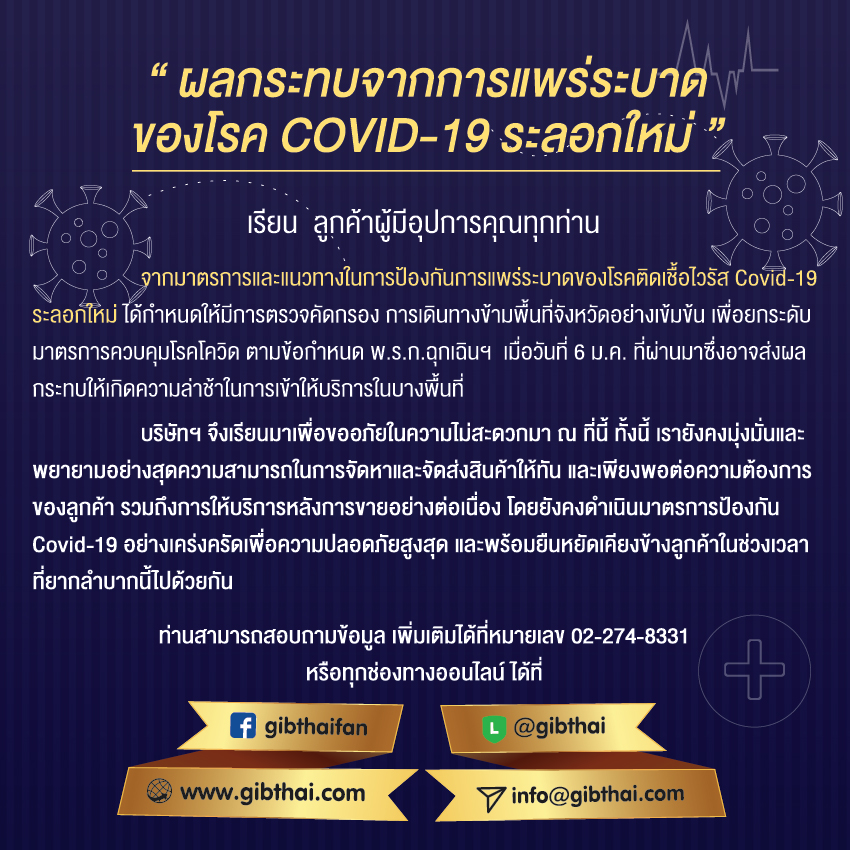 จากมาตรการและแนวทางในการป้องกันการแพร่ระบาดของโรคติดเชื้อไวรัส Covid-19 ระลอกใหม่ เมื่อเดือนมกราคม ที่ผ่านมา อาจส่งผลกระทบให้เกิดความล่าช้าในการเข้าให้บริการในบางพื้นที่ บริษัท กิบไทย จำกัด จึงเรียนมาเพื่อขออภัยในความไม่สะดวกมา ณ ที่นี้ ท่านสามารถสอบถามข้อมูลเพิ่มเติมได้ที่หมายเลข 02-274-8331 หรือทุกช่องทางออนไลน์ ได้ที่ Facebook: @gibthaifan | LINE OA: @gibthai | Website: www.gibthai.com | E-mail: info@gibthai.com