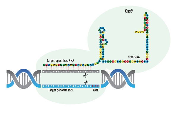 CRISPR ย่อมาจาก Clustered regularly interspaced short palindromic ซึ่งเป็นหนึ่งในเทคโนโลยี genome editing สำหรับการศึกษาหน้าที่ของยีน (gene function) โปรตีน CRISPR-associated (Cas) พบในแบคทีเรียหลายชนิดโดยส่วนใหญ่จะเป็นกลุ่ม archaea bacteria ตัว CRISPR-Cas จะเป็นการทำงานร่วมกันของ ลำดับเบสที่ออกแบบไว้อย่างจำเพาะ (RNA guided sequence) และ Caspase 9 เพื่อทำหน้าที่ในการตัด DNA และเปลี่ยนแปลงเป็นยีนตัวใหม่หรือหน้าที่บางอย่างเปลี่ยนไป เนื่องจากคุณสมบัติการทำงานของ endonuclease cleavage specificity ที่อยู่ใน CRISPR Cas โดยใช้ guide RNA sequence นำไปพร้อมกับ Cas endonuclease ไปยังตำแหน่งเป้าหมาย CRISPR-Cas9 ประกอบด้วย 3 ส่วน คือCas nuclease Cas9, ตำแหน่งคู่สมของเป้าหมาย crRNA และ TracerRNA ซึ่ง crRNA และ tracrRNA จะถูกแสดงออกมาจาก express vector พร้อมกันเป็น guide RNA ที่เลียนแบบการทำงานตามธรรมชาติของระบบแบคทีเรีย เราทำแค่เพียงออกแบบตำแหน่ง double strand ของสายโอลิโกด์ที่จำเพาะกับตำแหน่งที่ต้องการ |
