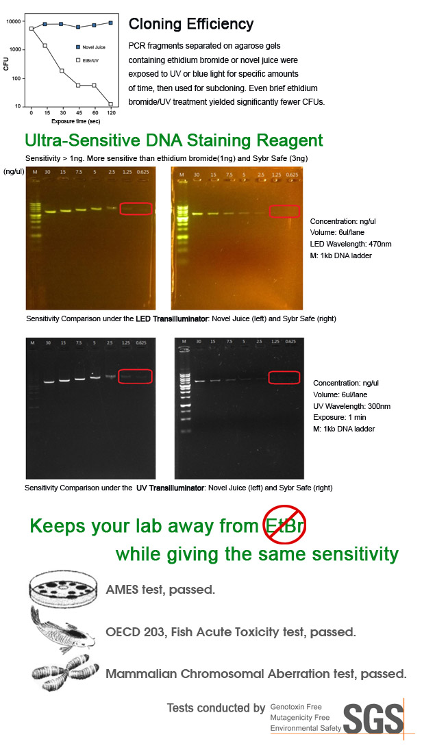 | Description Novel Juice is a non-mutagenic fluorescent reagent that produces instant visualization of DNA bands upon Blue Light or UV illumination of agarose gels. Supplied in GeneDireX’s 6X DNA Loading Buffer, Novel Juice is used to prepare DNA markers and samples for loading on agarose or polyacrylamide gels. Novel Juice is the most sensitive stain available for detecting the double-stranded DNA (dsDNA). It contains three tracking dyes (Bromophenol Blue, Xylene Cyanol FF, and Orange G) for visually tracking the DNA migration during the electrophoresis process. It is ideal for the environment requiring a safe , non-hazardous alternative to Ethidium Bromide. |