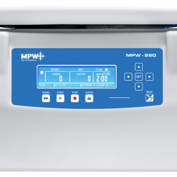 The MPW-260 centrifuge is a ventilated laboratory centrifuge designed for general use. Together with the MPW-260R and MPW-260RH, they form a centrifuge family, which, thanks to the ability to configure with a large number of available rotors, ensures the versatility of the applications and precision of the spinning process. They are used in medical, biochemical, veterinary, industrial and other laboratories. The MPW-260 is used, among other, for urinalysis, blood preparations, sludge dewatering, DNA, RNA and many others.