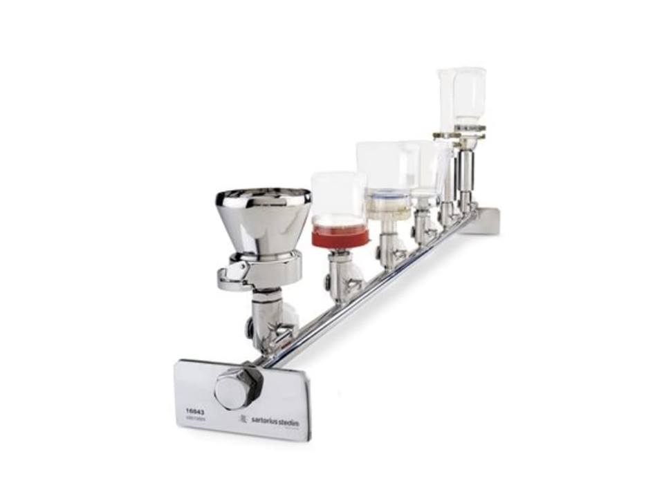 Combisart® system for microbiological analysis or particle count in quality assurance. The system features a modular design and field-proven standard accessories to make your choice easier. At the heart of the Combisart® system is a stainless steel manifold, designed to accommodate all types of filter holders and funnels, such as ready-to-use funnels, flammable units, like stainless steel funnels for colony counting and autoclavable glass and polycarbonate filter holders.
