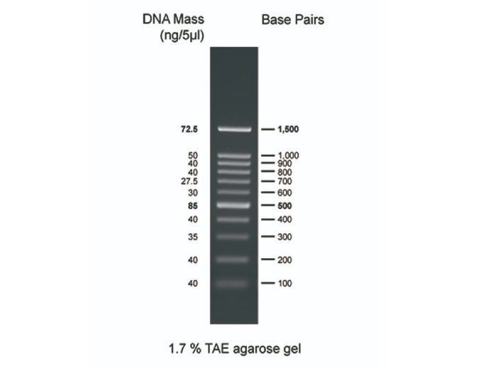 | Description A unique combination of PCR products and a number of proprietary plasmids digested with appropriate restriction enzymes to yield 11 fragments, suitable for use as molecular weight standards for agarose gel electrophoresis. The DNA includes fragments ranging from 100-1,500 base pairs. The 500 and 1,500 base pair bands have increased intensity to serve as reference points. The approximate mass of DNA in each band is provided (0.5 μg a load) for approximating the mass of DNA in comparably intense samples of similar size. |