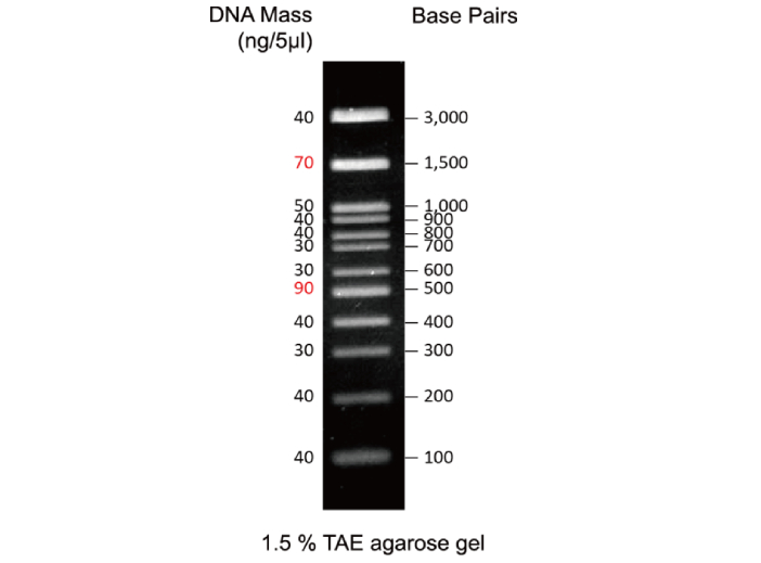 | Description A unique combination of PCR products and a number of proprietary plasmids digested with appropriate restriction enzymes to yield 12 fragments, suitable for use as molecular weight standards for agarose gel electrophoresis. The DNA includes fragments ranging from 100-3,000 base pairs. The 500 and 1,500 base pair bands have increased intensity to serve as reference points. The approximate mass of DNA in each band is provided (0.54 μg a load) for approximating the mass of DNA in comparably intense samples of similar size. |