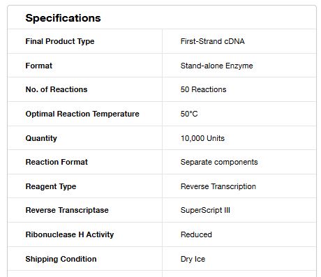 Invitrogen SuperScript III Reverse Transcriptase is a genetically engineered MMLV reverse transcriptase (RT) created by the introduction of several mutations for reduced RNase H activity, increased half-life, and improved thermal stability. SuperScript III RT offers higher cDNA yields, improved cDNA lengths, improved efficiency on GC-rich target RNAs, and overall better performance than wild-type MMLV and MMLV RNase H-minus enzymes.