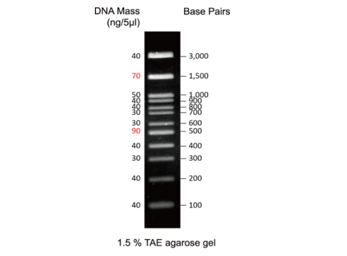 A unique combination of PCR products and a number of proprietary plasmids digested with appropriate restriction enzymes to yield 12 fragments, suitable for use as molecular weight standards for agarose gel electrophoresis. The DNA includes fragments ranging from 100-3,000 base pairs. The 500 and 1,500 base pair bands have increased intensity to serve as reference points. The approximate mass of DNA in each band is provided (0.54 μg a load) for approximating the mass of DNA in comparably intense samples of similar size.