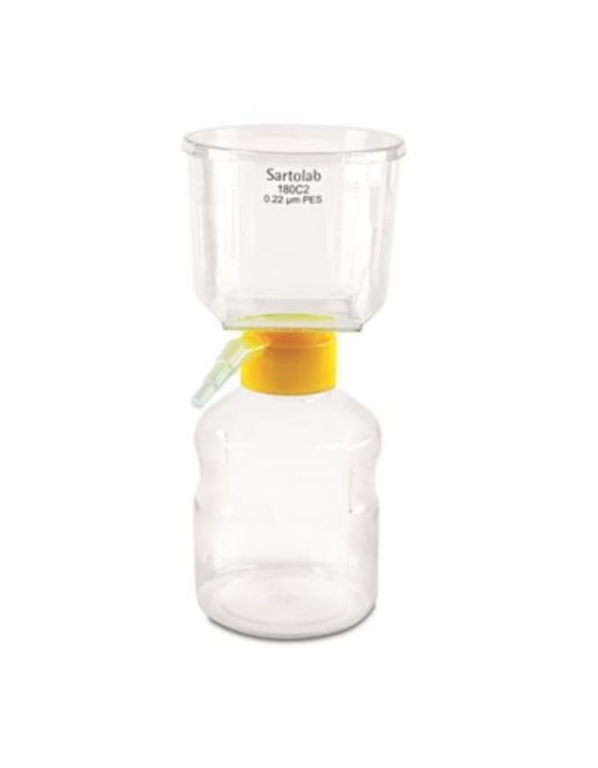 Sartolab RF/BT are disposable vacuum filtration units. The units including receiver flask (RF) contain an optimized Sartorius PES membrane and combine highest flow-rates and throughput with extremely low protein binding and extractables. They are therefore the product of choice for sterile filtration of tissue culture media, buffers, additives and other aqueous biologicals. Sartolab RF vacuum units are available as 150 ml, 250 ml, 500 ml and 1000 ml units.