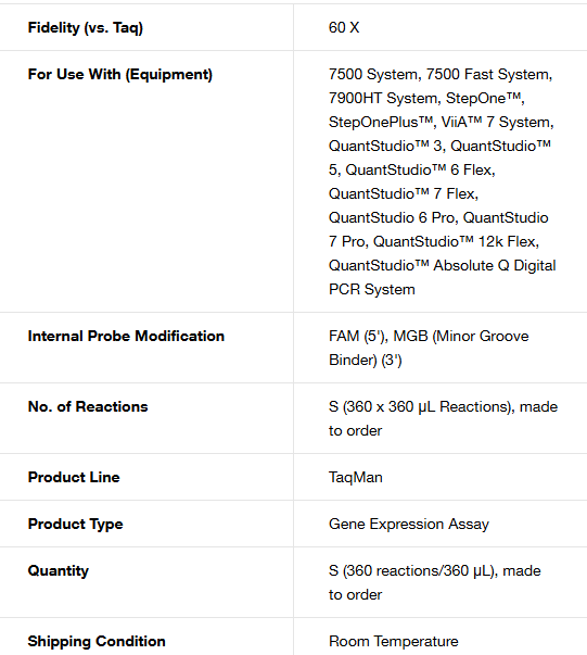 - Gold-standard TaqMan qPCR chemistry—TaqMan assays draw on Thermo Fisher Scientific's bioinformatics assay design pipeline to help ensure high specificity and minimal cross-reactivity, even for gene variants with high sequence homology
