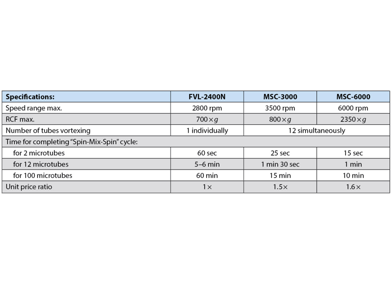 Multi–Spin allows considerable time saving compared to Combi–Spin by automatically performing cycling program of sample mixing and spinning according to the set spin–mix–spin cycle for 12 microtubes simultaneously.