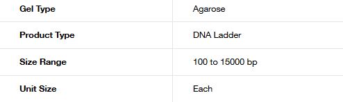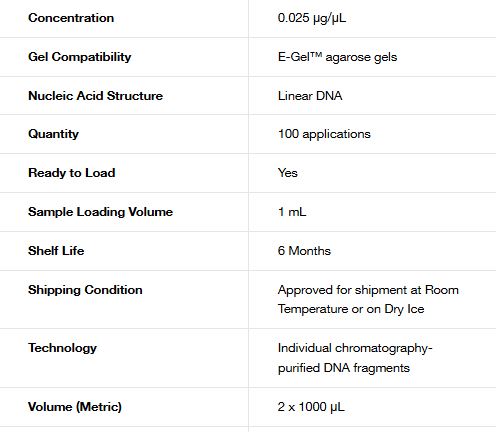 Invitrogen E-Gel 1 Kb Plus DNA Ladder is designed for sizing and approximate quantification of double-stranded DNA in the range of 100 bp to 15,000 bp. E-Gel 1 Kb Plus DNA Ladder consists of 18 individual chromatography-purified DNA fragments and has a reference band at 1,500 bp for easy orientation.