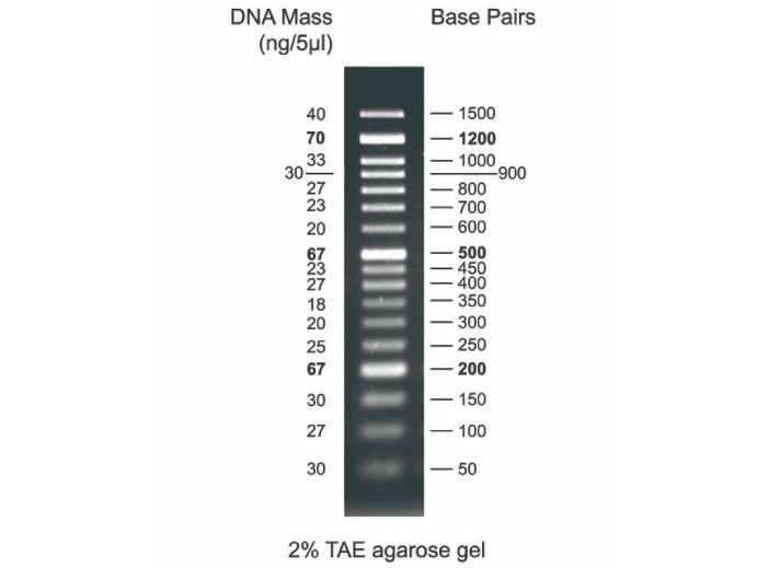 A unique combination of PCR products and a number of proprietary plasmids digested with appropriate restriction enzymes to yield 17 fragments, suitable for use as molecular weight standards for agarose gel electrophoresis. The DNA includes fragments ranging from 50-1,500 base pairs. The 200, 500 and 1200 base pair bands have increased intensity to serve as reference points. The approximate mass of DNA in each band is supplied as (0.56 μg per loading) for estimating the mass of DNA in comparably intense samples of similar size.