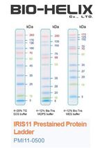 The IRIS11 Prestained Protein Ladder is a combination of 11 pre-stained proteins with molecular weights from 3 to 260 kDa. The 11 recombinant proteins are covalently coupled with blue chromophore, while 2 red bands at 70 kDa and 260 kDa, a green band at 15 kDa and a newly designed peacock green band at 60 kDa serve as reference bands. The IRIS11 Prestained Protein Ladder keeps track of the size and separation of proteins during SDS-polyacrylamide gel electrophoresis, approximating the target protein size and validating the Western transfer efficiency on PVDF, nylon, or nitrocellulose membranes.
