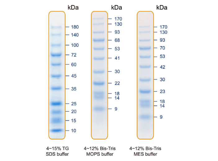 The Blu11 (BlueAQUA) Prestained Protein Ladder is a combination of 11 pre-stained proteins with molecular weights from 10 to 180 kDa. The 11 recombinant proteins are covalently coupled with blue chromophore, and 2 reference bands at 25 kDa and 72 kDa serve as reference bands. The Blu11 (BlueAQUA) Prestained Protein Ladder keeps track of the size and separation of proteins during SDS-polyacrylamide gel electrophoresis, approximating protein size and validating Western transfer efficiency on PVDF, nylon, or nitrocellulose membranes.