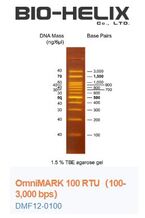 The OmniMARK 100 RTU includes fragments ranging from 100-3,000 base pairs. The 500 and 1,500 base pair bands have increased intensity to serve as reference points. The approximate mass of DNA in each band is provided (0.54 μg per loading) for approximating the mass of DNA in comparably intense samples of similar size.