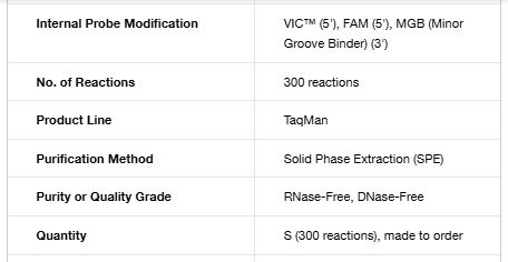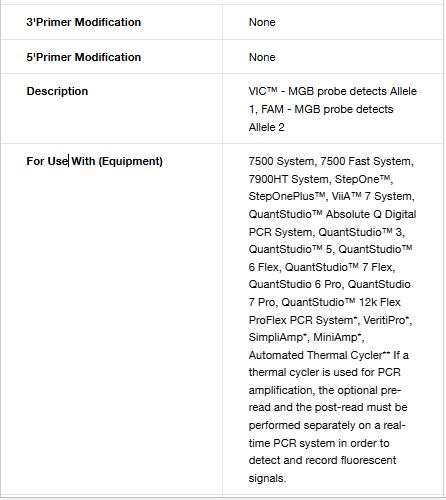 Applied Biosystems TaqMan SNP Genotyping Assays use TaqMan 5'‐nuclease chemistry to amplify and detect specific polymorphisms in purified genomic DNA samples. Each assay enables genotyping of individuals for a single nucleotide polymorphism (SNP) and consists of two sequence-specific primers and two TaqMan minor groove binder (MGB) probes with non-fluorescent quenchers (NFQ). One probe is labeled with VIC dye to detect the Allele 1 sequence; the second probe is labeled with FAM dye to detect the Allele 2 sequence.