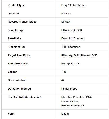Contains 5 x 1 mL tubes of 4X RT-PCR master mix sufficient for 1000 x 20 μL reactions.