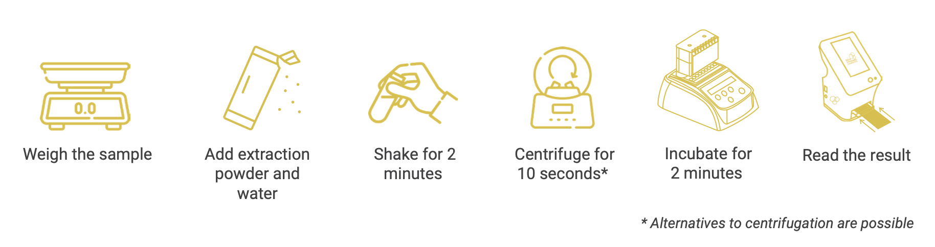 Analysable materials: wheat, corn, barley (with hull), oat groats, whole oats, corn germ, corn gluten meal, durum wheat, rye, sorghum, brown rice. Sample preparation: grinding, extraction, centrifugation or filtration, dilution with buffer Assay time: 2 minutes Measuring range: