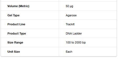 Invitrogen TrackIt 100 bp DNA Ladder is ready to use and designed for sizing and approximate quantification of double-stranded DNA in the range of 100 bp to 2,000 bp. 100 bp DNA Ladder consists of 13 individual chromatography-purified DNA fragments and has reference bands at 2000, 1500, and 600 bp for easy orientation.