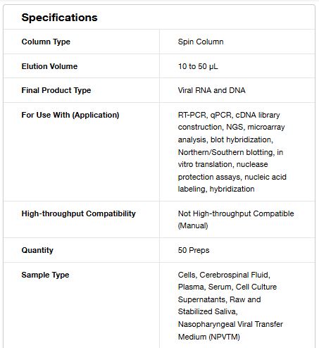 • Rapid and efficient purification of high-quality viral nucleic acid using spin column-based centrifugation with no sample cross-contamination