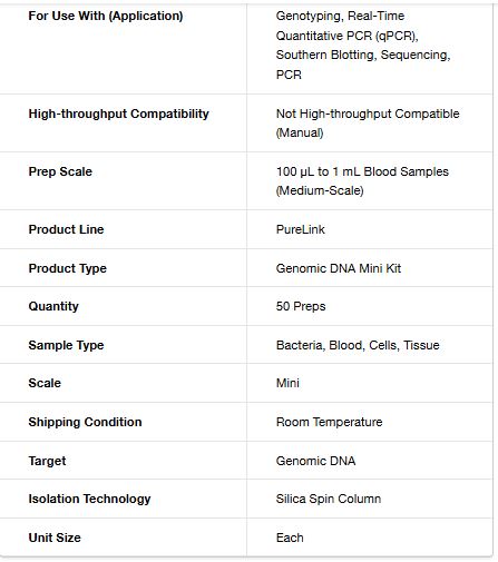 The PureLink™ Genomic DNA Mini Kit enables high-yield, high-purity, genomic DNA (gDNA) extractions from a wide variety of sample types. Use this single kit for genomic DNA purification from blood, tissues, cells, bacteria, swabs, and blood spots, with a familiar silica-based, microcentrifuge spin-column format. Features of the PureLink™ Genomic DNA Mini Kit include: