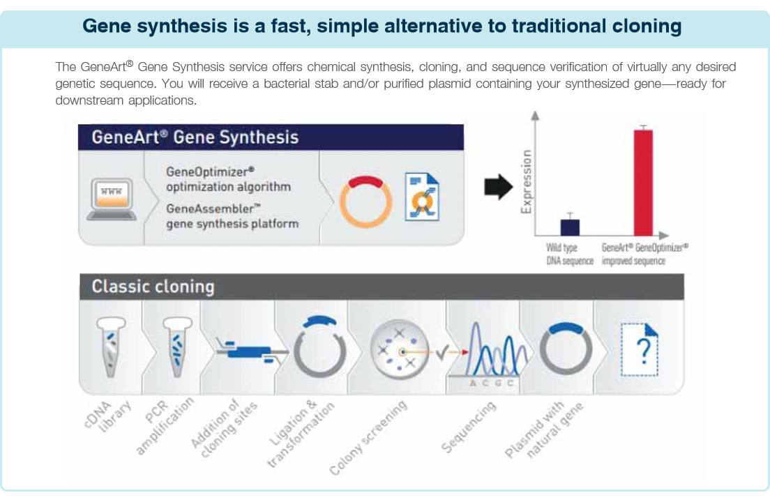 GeneArt เป็นบริการสังเคราะห์ลำดับ DNA ภายใต้แบรนด์ Thermofisher ประเทศสหรัฐอเมริกา เพื่อให้ได้ลำดับ DNA ที่ต้องการ ถูกต้องตามต้นแบบ และตอบโจทย์การประยุกต์ใช้ของผู้ทำงานวิจัย เช่น ใช้เป็น positive control ในการทำ PCR และ Real-time PCR, ใช้ทำ DNA hybridization, สามารถสร้าง fusion genes หรือ mutation gene, สังเคราะห์ยีนแล้วนำเข้า cloning vector หรือ sub-cloning gene สู่ expression vector เพื่อนำไปผลิตโปรตีน ยิ่งไปกว่านั้นยังสามารถแจ้ง optimize codon ให้เหมาะสมต่อ host ที่ใช้ผลิตโปรตีน เพื่อช่วยส่งเสริมให้ได้มีการผลิตโปรตีนมากขึ้น รวมถึงสามารถสังเคราะห์ DNA ต้นแบบเพื่อใช้ในการสร้าง guide RNA ในงาน Genome editing (CRISPR borse replica Dior) แม้กระทั่งสังเคราะห์ DNA ของสิ่งมีชีวิตที่หาได้ยากจากธรรมชาติ ก็สามารถทำได้