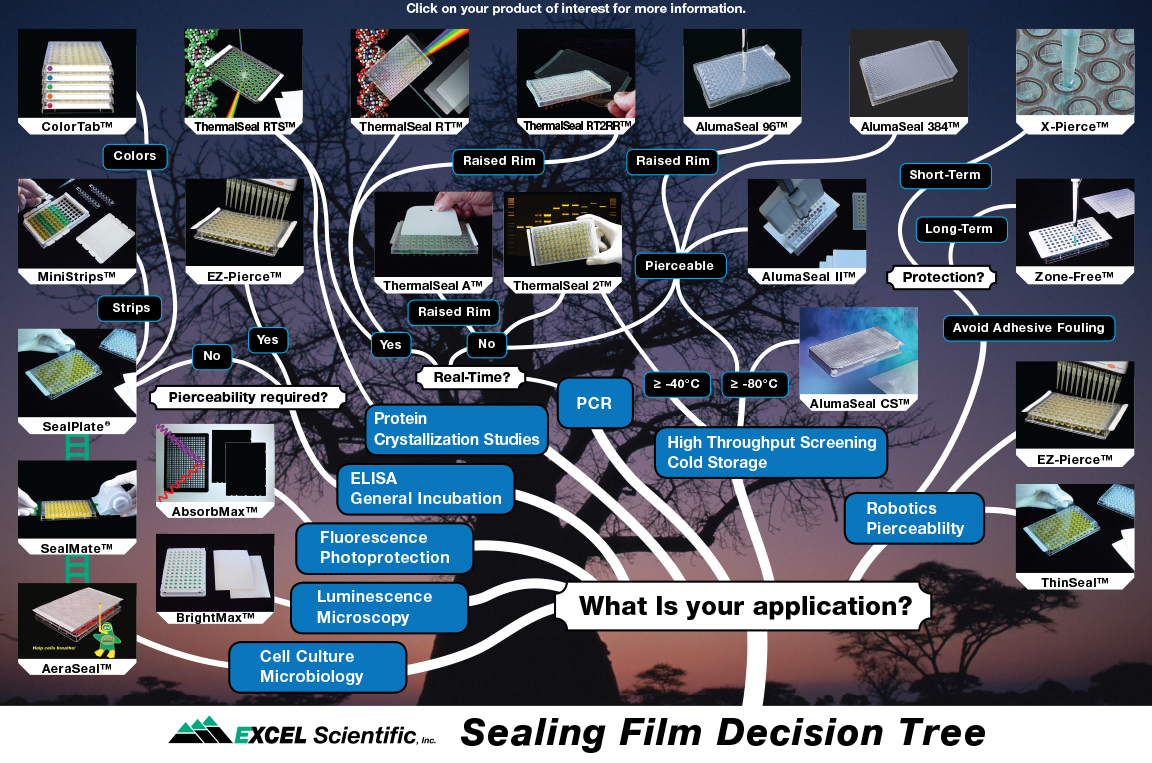 บริษัท Excel Scientific เป็นผู้นำด้านการผลิตแผ่นปิดฝาเพลท (sealing film) และฟรอยด์ที่มีชื่อเสียงจากประเทศสหรัฐอเมริกา แผ่นฟิล์มทำจากวัสดุที่หลากหลาย เพื่อให้เหมาะสมกับงานที่ใช้ ไม่ว่าจะเป็น AbsorbMaxTM sealing films ที่ทำมาจาก black Vinyl film สำหรับงานฟลูออเรสเซนต์, ThermalSeal RTSTM sealing films ที่ทำมาจาก polyolefin films สำหรับงาน real time PCR หรือจะเป็น eXTRemeTM sealing films สำหรับงาน PCR หรือปิดเพลทสำหรับงานทั่วไป ซึ่งทำมาจาก Polyester เป็นต้น นอกจากฟิล์มแล้ว Excel Scientific ยังมี Film-sealing paddles และ plate Roller เพื่อช่วยให้การปิดฝาเพลททำได้ง่ายขึ้น ปิดได้เรียบสนิท ไร้ฟองอากาศ