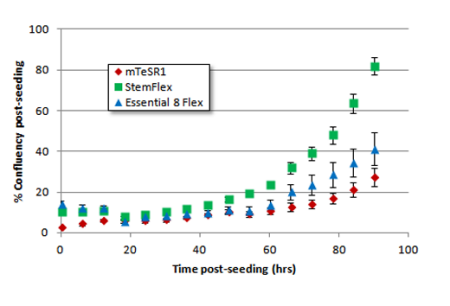 StemFlex ™ Medium เป็นอาหารเลี้ยงสเตมเซลล์ตัวอ่อน หรือ pluripotent stem cells (PSCs) ในสภาวะที่ไม่ใช้เซลล์ หรือ feeder-free system สนับสนุนการขยายตัวของเซลล์ต้นกำเนิด iPSC และปรับปรุงเพื่อรองรับการใช้งานใหม่ ๆ ให้เหมาะสำหรับการเลี้ยง single cell สำหรับงาน Genome editing (ภาพที่ 1) หรือ การ reprograming cell สูตรเฉพาะของ StemFlex™ Medium ให้ความสะดวกในการเปลี่ยนอาหารที่ยืดหยุ่น โดยไม่จำเป็นต้องเปลี่ยนทุกวัน (ภาพที่ 2,4)   และความสามารถในการเลือกเมทริกซ์และสารละลายที่เหมาะสมกับการใช้งานเฉพาะ StemFlex Medium ช่วยให้ PSC ปลอดสารอาหารในระยะยาวโดยไม่มีความผิดปกติแบบ karyotypic และรักษาความสามารถในการ differentiate และส่งเสริมการเปลี่ยนแปลงเป็น three germ layers ได้ดี