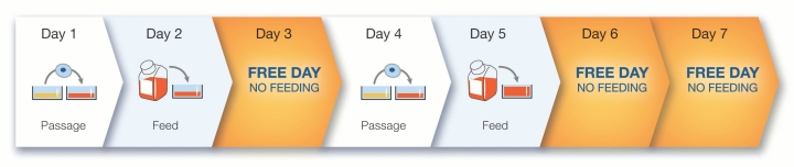 ภาพที่ 4 ตารางแนะนำการเลี้ยงเซลล์แบบ weekend-free ซึ่งไม่จำเป็นต้องเปลี่ยนอาหารทุกวัน