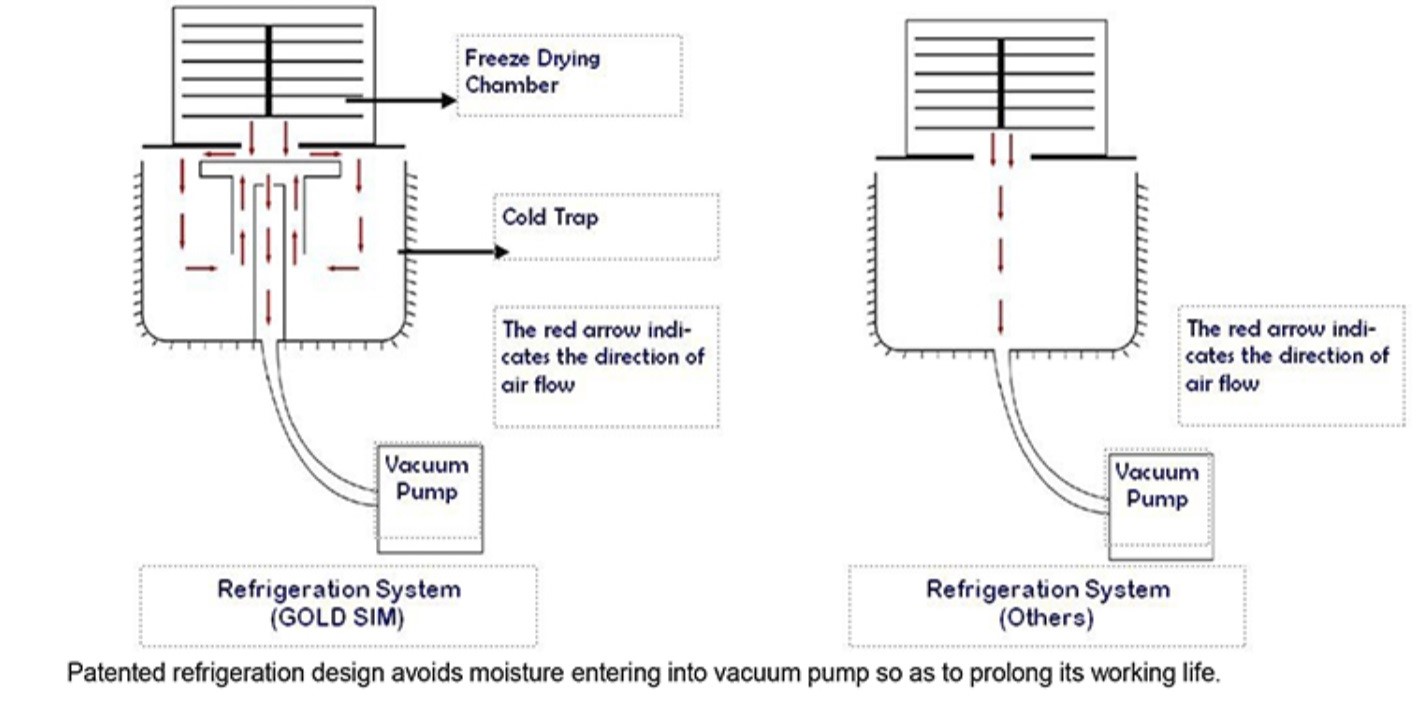 ฟังก์ชัน Vacuum backfilling เป็นระบบป้องกันการเชื่อมต่อระหว่างปั๊มสุญญากาศ และระบบไล่อากาศอัตโนมัติ เมื่อปั๊มสุญญากาศหยุดทำงาน ระบบไล่อากาศอัตโนมัติจะทำงาน เพื่อป้องกันการปนเปื้อนของน้ำมันจากเครื่องปั๊มสุญญากาศเข้าสู่ระบบท่อสุญญากาศ นอกจากนี้ ปั๊มสุญญากาศประสิทธิภาพสูงยังช่วยเร่งการทำงานในการกำจัดความชื้น และเพิ่มประสิทธิภาพของการทำความเย็นของเครื่องทำแห้งแบบแช่เยือกแข็ง