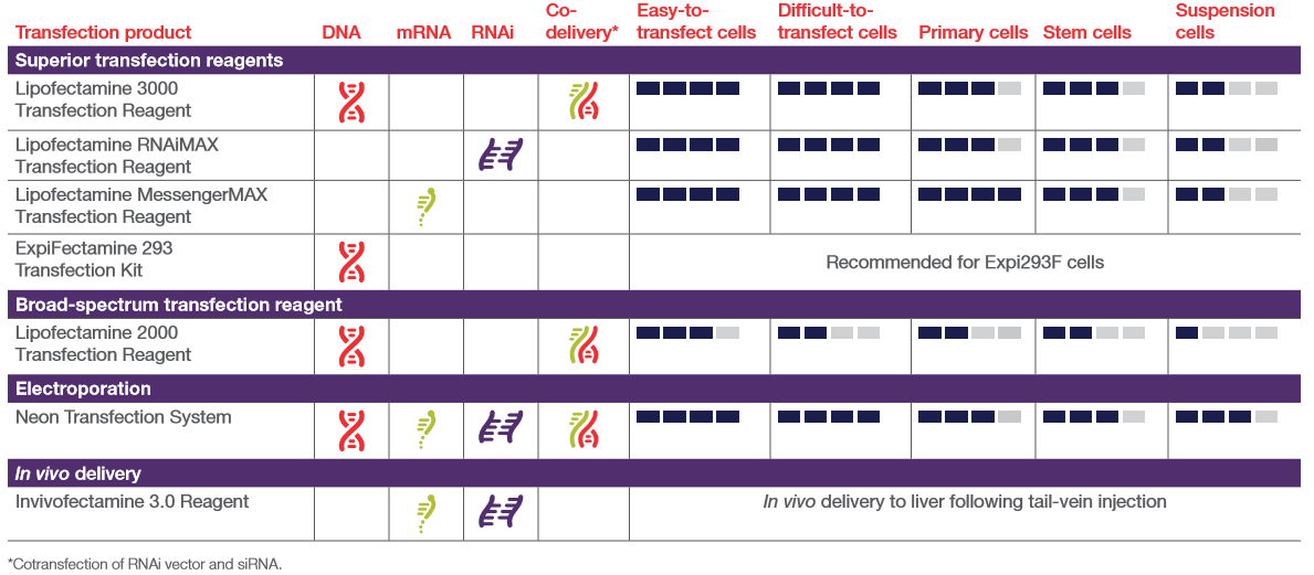 สินค้ากลุ่ม cationic lipid mediated transfection reagent ของบริษัท Thermofisher ภายใต้แบรนด์ Invitrogen ที่รู้จักกันดีในชื่อ Lipofectamine® นับเป็น transfection reagent ที่ได้รับความนิยมและมีประสิทธิภาพในการนำ DNA/RNA/Protein เข้าสู่เซล์อย่างมาก รวมถึงมีใช้ในเซลล์หลากหลายประเภท และได้รับการตีพิมพ์ลงในวารสารมากมาย ซึ่ง Lipofectamine® สามารถเลือกใช้งานได้ตามชนิดของสารพันธุกรรมดังนี้