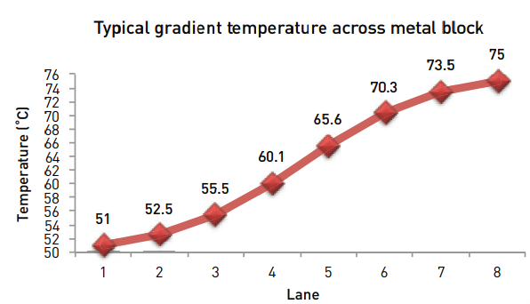 Annealing temperature มีความสำคัญต่อการเข้าจับของ primers กับลำดับเบสของ target gene ดังนั้นการที่จะเพิ่มปริมาณของชิ้นส่วนยีนที่สนใจ การหาสภาะวะหรืออุณหภูมิที่เหมาะสมจึงเป็นสิ่งสำคัญต่อการทำ PCR ในปัจจุบันมีเทคโนโลยี Gradient block ซึ่งถูกออกแบบมาเพื่อให้สามารถตั้งค่าอุณหภูมิเฉลี่ย โดยตั้งค่าที่ขอบทั้งสองด้านของบล็อกโลหะ ส่งผลให้มีการไล่ระดับของอุณหภูมิของแต่ละ column หรือแถว ทำให้ผู้ใช้งานสามารถเลือกอุณหภูมิใดอุณหภูมิหนึ่งในการทำ PCR ได้แต่อย่างไรก็ตาม การที่ระบบ gradient มีระบบ two separate heating/cooling elements ที่อยู่ด้านล่างบล็อกโลหะ (รูปที่ 1.) ทำให้การไล่ระดับอุณหภูมิเชิงเส้นที่แท้จริงนั้นไม่สามารถทำได้เนื่องจากความร้อน ระหว่างอุณหภูมิสูงและต่ำที่ตั้งไว้ที่ปลายแต่ละด้านของ จะส่งผลให้อุณหภูมิที่ได้อยู่ในรูปแบบ sigmoidal curve (รูปที่ 2.)