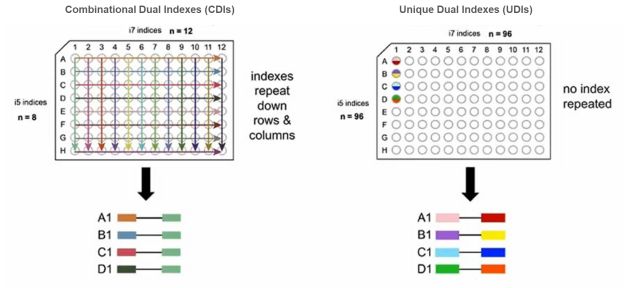 รูปที่ 2 Index adaptor แบบ Combinatorial Dual Indexes (CDIs) และ Unique Dual Indexes (UDIs)