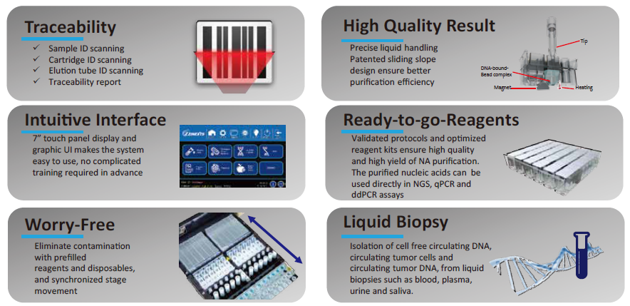 - Liquid Biopsy: สามารถประยุกต์ใช้กับตัวอย่างหลากหลายชนิดในการสกัดสารพันธุกรรมในการศึกษา cell free DNA เช่น พลาสมา ซีรั่ม Buffy coat น้ำลาย หรือปัสสาวะ ไม่เพียงแต่ตัวอย่างที่เป็น Liquid biopsy เท่านั้น Magpurix EVO® สามารถสกัดสารพันธุกรรมได้ในหลากชนิดของตัวอย่างเช่น เนื้อเยื่อสด เนื้อเยื่อที่เตรียมแบบ FFPE เซลล์เพาะเลี้ยง ตัวอย่าง Swab เสมหะ อุจจาระ แบคทีเรีย หรือตัวอย่างทางนิติวิทยาศาสตร์ เป็นต้น
