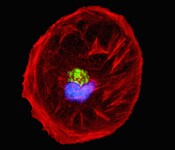HeLa cells labeled with NucBlue Live ReadyProbes Reagent and ActinRed 555 ReadyProbes Reagent.