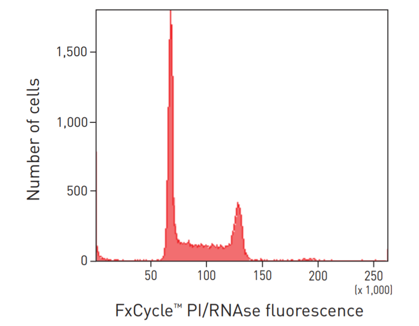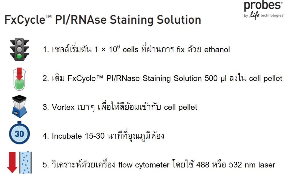FxCycle™ PI/RNase Staining Solution เป็นสารละลายที่ใช้สำหรับวิเคราะห์ปริมาณดีเอ็นเอหรือวิเคราะห์ Cell cycle ในเซลล์ โดยมาในรูปของน้ำยาพร้อมใช้ (ready-to-use) ที่มีองค์ประกอบของ Propidium iodide (PI) ซึ่งเป็นสีฟลูออเรสเซนต์สำหรับย้อม DNA อย่างไรก็ตามสี PI ยังสามารถย้อมติด RNA ได้ด้วย น้ำยา FxCycle™ PI/RNase Staining Solution จึงมาพร้อมกับเอนไซม์ RNase A เพื่อกำจัด RNA ออกจากตัวอย่าง ทำให้ผลการทดลองที่ได้มาคือปริมาณของ DNA เท่านั้น และมี permeabilization reagent ช่วยในการย้อมติดของสี PI ในเซลล์ โดยทั่วไปนักวิจัยที่ศึกษาด้าน cell cycle analysis จำเป็นจะต้องมีขั้นตอนของการเติม RNase A เพิ่มเข้ามา ทำให้เสียเวลา ยุ่งยาก หลากหลายขั้นตอน ดังนั้น เราสามารถลดขั้นตอนและประหยัดเวลาในการทดลองด้วย FxCycle™ PI/RNase Staining Solution เพียงแค่เติมลงใน Fixed cells จากนั้น Incubate และวิเคราะห์ด้วย Flow cytometry โดยที่ไม่จำเป็นต้องล้างตัวอย่างก่อนการวิเคราะห์