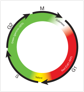 Premo™ FUCCI ใช้ติดตามวัฏจักรของเซลล์โดยการตรวจวัดการเกิด ubiquitination หรือกลไกการย่อยโปรตีน โดยตรวจวัดโปรตีนที่เกี่ยวข้องกับ cell cycle สองชนิดและใช้ฟลูออเรสเซนส์ที่มีสีแตกต่างกัน 2 สีได้แก่ geminin-GFP มีสีเขียว และ Cdt1-RFP ซึ่งมีสีแดง โปรตีนดังกล่าวมีการแสดงออกที่แตกต่างจำเพาะในแต่ละระยะของการแบ่งเซลล์ ในช่วงที่เกิดวัฏจักรของเซลล์จะมีการสลายโปรตีนบางชนิดเพื่อทำให้เข้าสู่ระยะถัดไปของการแบ่งเซลล์ โดยเอนไซม์ E3 ligases จะทำหน้าที่ในการย่อยสลายโปรตีนสองชนิดดังกล่าวและทำให้เกิดการเปลี่ยนแปลงของระดับโปรตีนในช่วงของการเกิดวัฏจักรของเซลล์ ในช่วงของระยะ G1 โปรตีน geminin-GFP จะถูกย่อยไปทำให้สามารถตรวจวัด Cdt1-TagRFP ในนิวเคลียสซึ่งมีสีแดง จากนั้นเมื่อเข้าสู่ระยะ S, G2 และ M โปรตีน Cdt1-TagRFP จะถูกย่อยไปทำให้สามารถตรวจวัด Cdt1-TagRFP ในนิวเคลียสซึ่งมีสีเขียว ส่วนในระยะ G1/S transition ระดับของโปรตีน Cdt1ลดลง และระดับของ geminin เพิ่มขึ้น ในระยะนี้จึงทำให้เกิดการแสดงออกของโปรตีนทั้งสองชนิดและนิวเคลียสเซลล์ที่อยู่ในระยะนี้จึงเป็นสีเหลือง (รูปที่ 1) การเปลี่ยนแปลงของสีที่เกิดขึ้นทำให้สามารถติดตามและอธิบายการเกิดวัฏจักรของเซลล์และการแบ่งเซลล์ได้อย่างชัดเจน