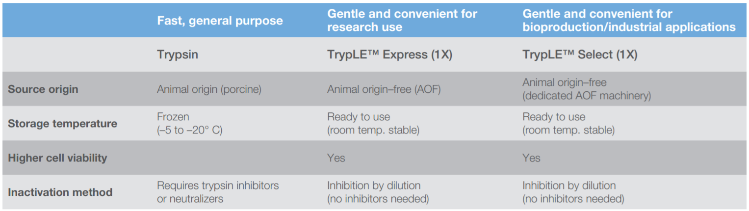 ตาราง 1 แสดงข้อมูลเปรียบเทียบระหว่าง Trypsin, TrypLE Express และ TrypLE Select