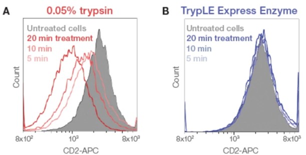 รูปที่ 1 แสดงผลการทดลองจากการศึกษาการแสดงออกของ cell surface marker ชนิด CD2 ในเซลล์ Jurkat เมื่อใช้0.05% trypsin (A) และ TrypLE Express reagent (B)โดยใช้เวลาในการบ่มที่ 0, 5, 10 และ 20 นาที จากกราฟฮิสโตแกรมแสดงให้เห็นว่าการแสดงออกของ CD2 ลดลงเมื่อใช้เวลาบ่มใน 0.05% trypsinที่นานขึ้น แต่ระดับของการแสดงออกของ CD2 ไม่มีการเปลี่ยนแปลงเมื่อบ่มด้วย TrypLE Express reagent