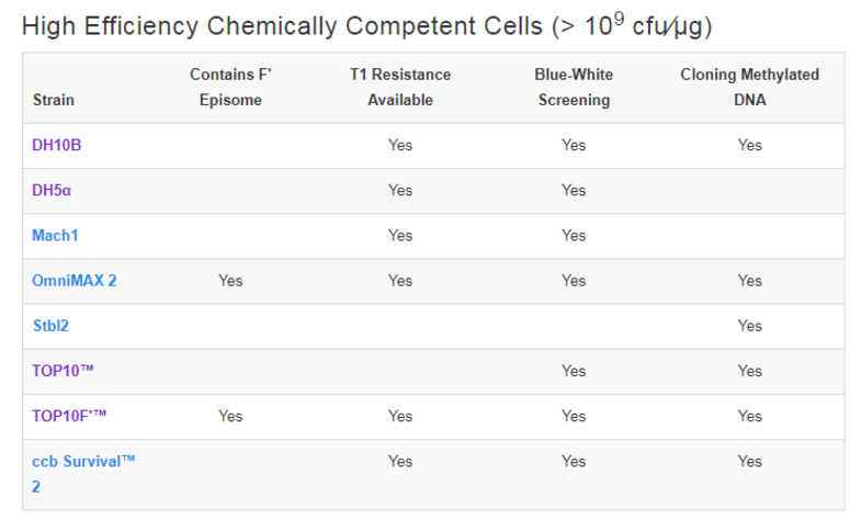 นอกจากนี้ ทาง Invitrogen™ยังแนะนำ Competent Cell แต่ละสายพันธุ์ ในเชิงของประสิทธิภาพที่ได้หลังจากการทรานส์ฟอร์ม และการคัดเลือกทรานส์ฟอร์มแมนท์ รายละเอียดดังตารางนี้