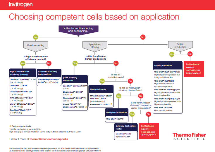 เพื่อให้งานโคลนยีนง่าย สะดวก และนำไปสู่ความสำเร็จตามแผนที่วางไว้ ทาง Invitrogen™ ได้แนะนำวิธีการเลือกชนิดของ Competent Cell โดยแบ่งตามการนำไปประยุกต์ใช้ ดังแผนผังนี้