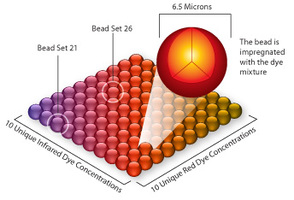 Luminex xMAP เป็นเทคโนโลยีที่ใช้ paramagnetic microspheres หรือ beadsที่ภายในจะมีสีแดง และ infrared fluorophores ความเข้มแสงต่างๆกัน(ภาพที่ 1) ซึ่งความเข้มแสงฟลูออเรสเซนต์ที่ต่างกันนี้ถูกใช้เป็นตัวแยก Beads ให้ต่างกันออกไปเป็น Unique number หรือ Bead region ที่แตกต่างกัน โดย Beads เหล่านี้จะถูกเคลือบด้วย Antibody ที่จำเพาะต่อโปรตีนที่แตกต่างกันออกไป โดย 1 Bead จะถูกเคลือบด้วย 1 Antibody สำหรับ 1 Target ดังนั้นหากต้องการศึกษาหลาย Target พร้อมกัน (Multiplex) ก็สามารถนำ Beads มารวมในหลุมเดียวกันของ 96-well plate ได้ โดยเครื่องวิเคราะห์ Luminex platform จะสามารถแยก Target แต่ละตัวได้จากความแตกต่างของความเข้มสีฟลูออเรสเซนต์ หรือ Bead region นั่นเอง