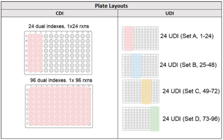 1. Several index adapters: นักวิจัยสามารถเลือกใช้ index ได้ทั้งแบบ Combinatorial Dual Indexes (CDIs) ที่มี index ในส่วน 5’ แตกต่างกัน และ 3’ index ที่เหมือนกัน หรือ Unique Dual Indexes (UDIs) มี index ในส่วน 5’ และ 3’ index ที่แตกต่างกัน