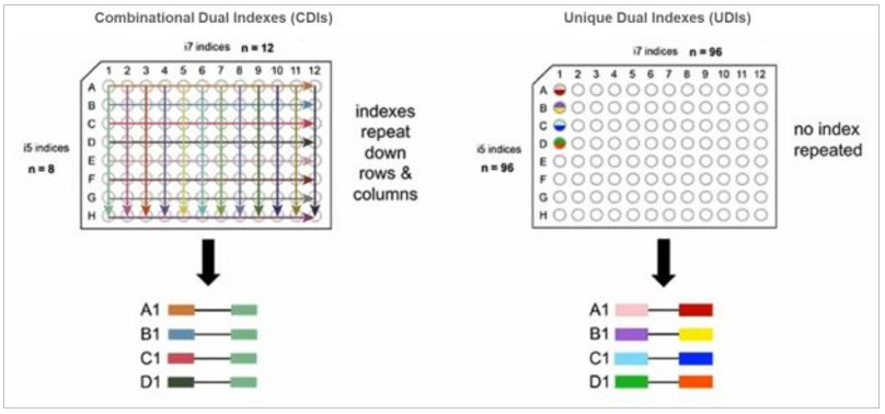 โดย UDIs นั้นถูกออกแบบมาเพื่อป้องกันการเกิด index hopping เนื่องจาก การใช้ CDI นั้นมีตำแหน่งของ 3’index มีการซ้ำกันระหว่าง samples ดังนั้นในขั้นตอนการทำ sequencing มีโอกาสที่จะเกิดการ switch ของ index ระหว่าง samples ประมาณ 1% และส่งผลต่อความถูกต้องของ sequence ในแต่ละ sample ขณะที่ UDIs มีโอกาสที่จะเกิดการ switch ของ index ระหว่าง samples เพียง 0.01% เท่านั้น