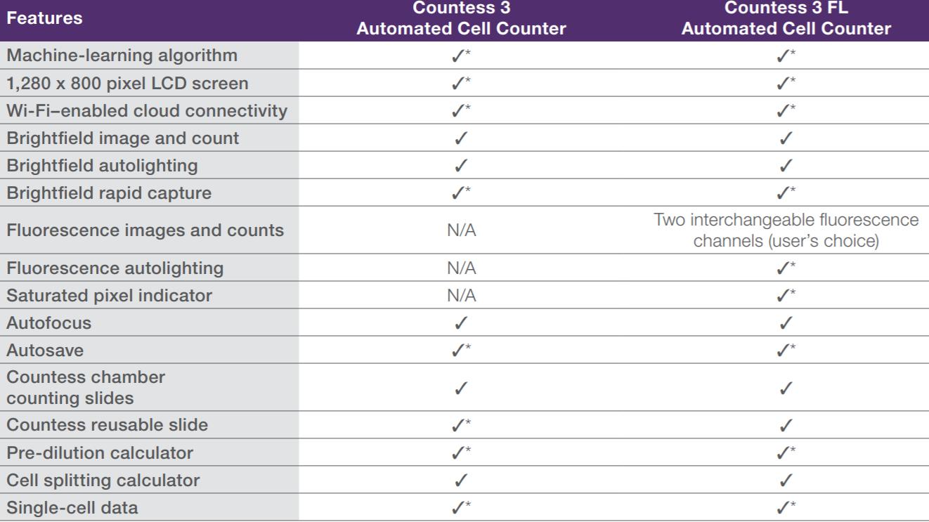 ตารางเปรียบเทียบคุณลักษณะเครื่องนับเซลล์อัตโนมัติรุ่น Countess® 3 และ 3 FL